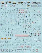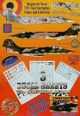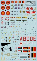 Mehr als 750 einzelne Decals zur Darstellung jeder Maschine im Dienst der belgischen Luftwaffe in Naturmetall und Südostasien-Tarnung, inklusive Aerobatic Team „Slivers“, Maschinen vom Tactical Air Meet 1978 und diverser Tiger Meets von 1966 bis 1981; komplette Stencils für eine Maschine sowie zahlreiche „Zappings“; inklusive 16-seitiger, farbiger Dekorationsanleitung