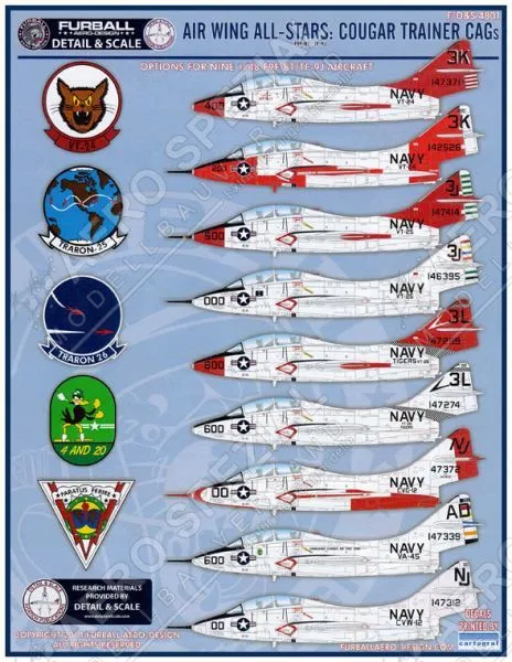 • F9F-8T Cougar: 142526, 3K/200, VT-24 „Bobcats“, NAS Chasefield, 1961; 147372, NJ/00, CVG-12, NAS Miramar, 1960;