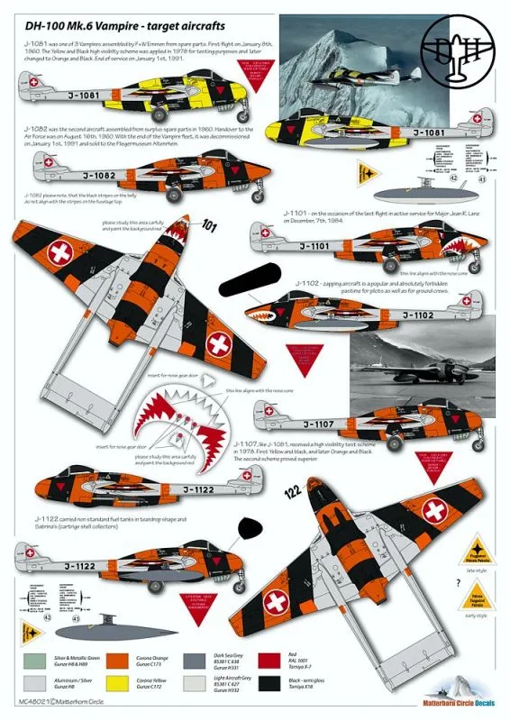 alle Maschinen Schweizer Luftwaffe; inklusive Maskierfolien für Cockpithaube und Nationalitätskennzeichen; komplette Markierungen für je eine D.H.100 und D.H.115