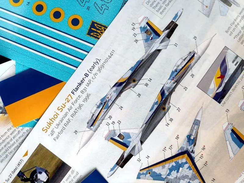 inklusive: Hintergrundberichte und Details; Profile und Anleitungen in Fotoqualität; Hinweise zu Flugzeugdetails; Tipps zu Farben und Bemalung; kleiner Sticker (ukrainische Flagge); empfohlene Video-Links