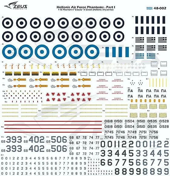 markings and basic stencils for 4 Hellenic Air Force jets in service with 337 Mira “Ghost (Fantasma)”, 338 Mira “Mars (Ares)” and 339 Mira “Ajax (Aeas)” in SEA, “Aegean Blue” and “Hill Grey II” camouflage;