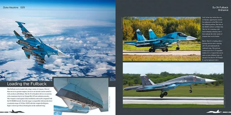 140 Seiten im Format 24 x 24 cm mit nahezu 300 Farbfotos (Action sowie Details von Cockpit, Rumpf, Tragflächen, Schubdüsen, Leitwerken usw.) der Su-34 Fullback im Dienst der russischen Luftwaffe; englischer Text;