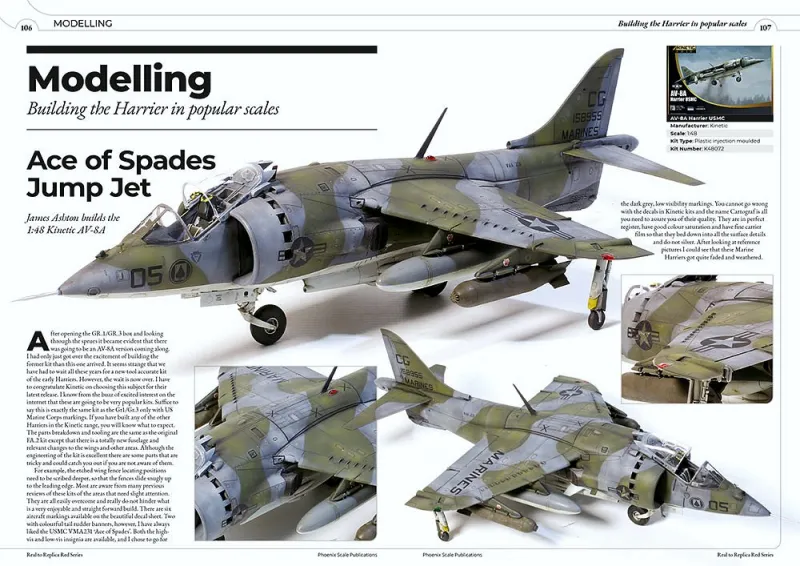 • 120 Seiten Format DIN A4; Entwicklung und Beschreibung der AV-8-Harrier-Varianten im Dienst internationaler Luftstreitkräfte (Italien, Spanien, Thailand, Vereinigte Staaten) mit 107 Farb- und 13 Schwarzweiß-Actionfotos; 21 Farbseitenrisse; „Walk Around“-Kapitel mit 36 farbigen Detailfotos; Listen mit technischen Daten und Harrier-Varianten; Modellbaureports des AV-8B Harrier II Plus von Trumpeter in 1:32 und Hasegawa in 1:48, AV-8A Harrier von Kinetic in 1:48 und Airfix in 1:72 sowie AV-8S Matador von Airfix in 1:72; englischer Text