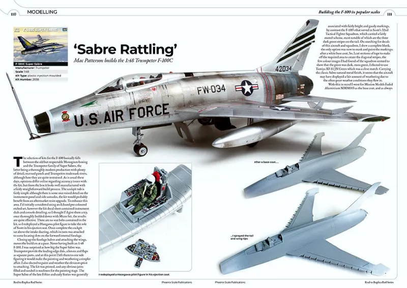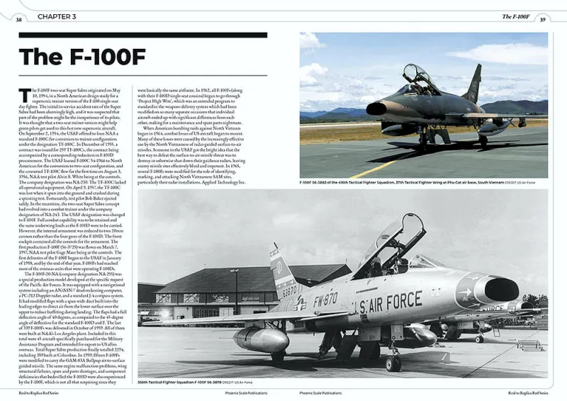 • 120 Seiten Format DIN A4; Entwicklung und Beschreibung der F-100-Varianten im Dienst internationaler Luftstreitkräfte (Dänemark, Frankreich, Taiwan, Türkei, Vereinigte Staaten) mit 47 farbigen und 39 Schwarzweiß-Actionfotos; 10 Farbseitenrisse; „Walk Around“-Kapitel mit 35 farbigen Detailfotos; Listen mit technischen Daten, F-100-Varianten und erhaltenen Exemplaren; Zeichnungen von F-100C/D/F Cockpits mit Legenden der Instrumente; Modellbaureports der F-100C Super Sabre von Trumpeter in 1:48 und F-100F Super Sabre von Trumpeter in 1:48; englischer Text