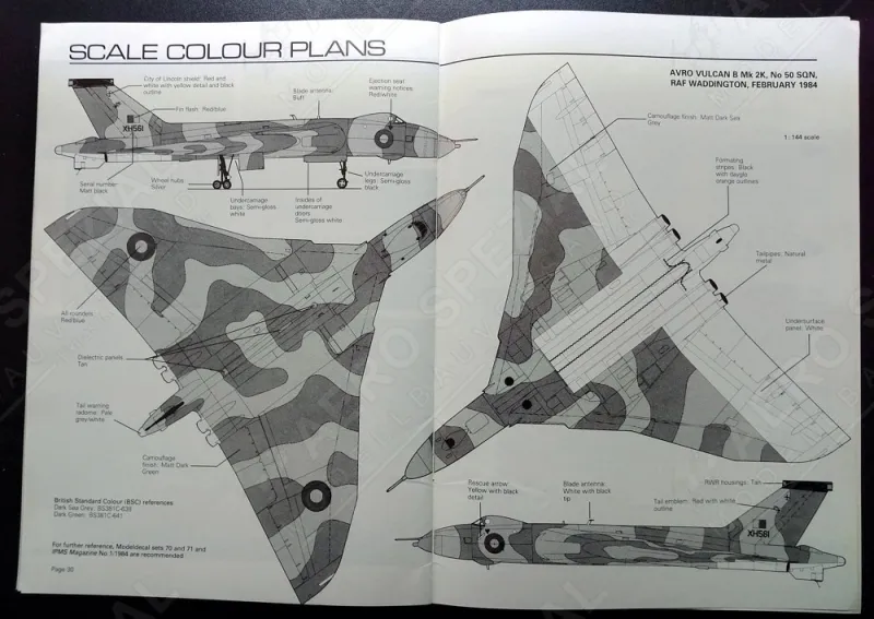 • 32 Seiten Format DIN A4; Kurzbeschreibung mit 1 farbigen und 8 Schwarzweiß-Actionfotos; „Walk Around“-Kapitel mit 61 Schwarzweiß-Detailfotos von Rumpf, Fahrwerk, Cockpit und Waffen; ein schwarzweißer Vierseitenriss in 1:144 mit Tarnschema der Vulcan B.2K, XH561, No. 50 Sqn, RAF Waddington, Februar 1984; 1 Farbseitenriss und 5 Schwarzweißseitenrisse; englischer Text
