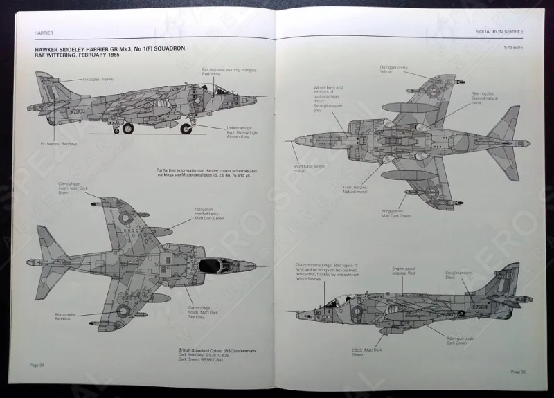 • 36 Seiten Format DIN A4; Kurzbeschreibung mit 6 farbigen und 23 Schwarzweiß-Actionfotos; „Walk Around“-Kapitel mit 55 Schwarzweiß-Detailfotos von Rumpf, Fahrwerk, Cockpit und Waffen; ein schwarzweißer Vierseitenriss in 1:72 mit Tarnschema der Harrier GR.3, XZ969/01, No. 1 (F) Sqn, RAF Wittering, Februar 1985; 1 Farbseitenriss und 5 Schwarzweißseitenrisse; englischer Text